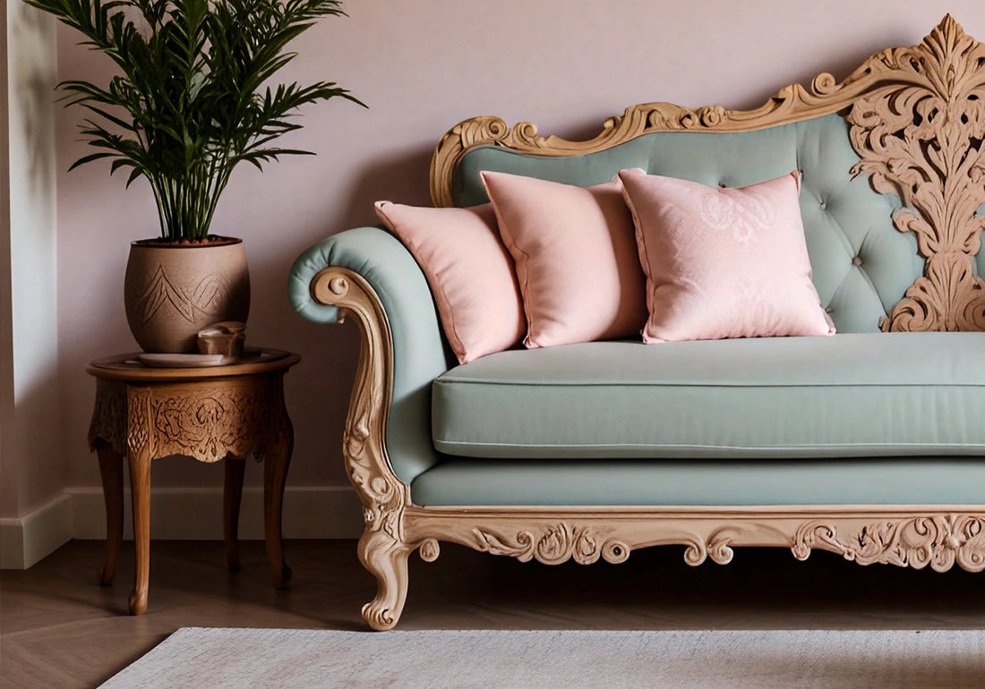 Gracefully handcrafted from premium solid teak wood, this 3-seater sofa brings natural warmth and timeless charm to your living space. The soft pastel upholstery paired with intricate floral carving creates a perfect balance of classic design and modern sophistication. Whether placed in a cozy corner or a formal setting, it makes a stunning centerpiece that speaks of comfort, style, and artisanal beauty.
