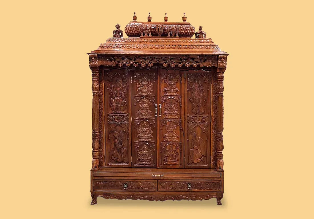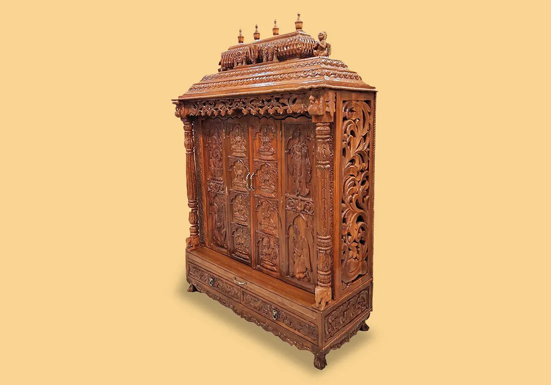 This temple is typically crafted from teak wood, celebrated for its durability and distinct grain patterns that become more pronounced with time. The antique finish imparts a sense of history and character to the wood, creating a warm and inviting ambiance in your home. The temple often features intricate hand-carved detailing, showcasing traditional motifs, sacred symbols, and cultural designs inspired by the era in which it was crafted.