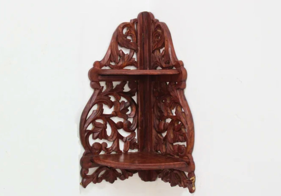 The Beautifully Hand-Carved Wooden Wall Corner combines form and function by offering both storage and a captivating focal point for your space. It's a perfect choice for those who appreciate the artistry of hand-carved woodwork and want to bring a touch of cultural or artistic richness into their interiors. This corner unit transforms unused wall corners into stunning showcases of craftsmanship and provides a unique and functional storage solution while enhancing the overall beauty of your living environment.