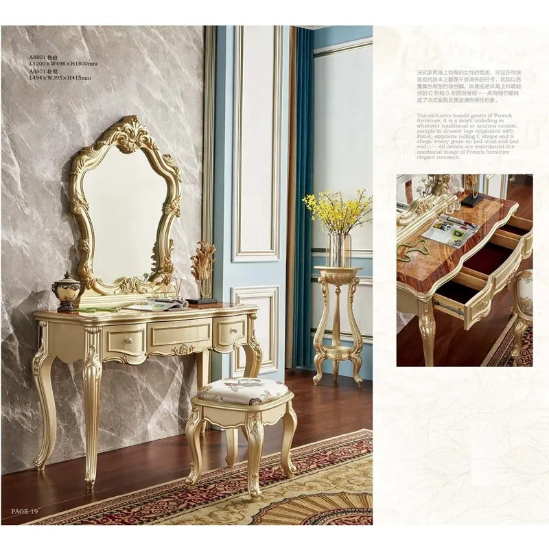 The Gold European Style hand carving dressing table is a statement piece, created for those with discerning taste and a passion for luxury.