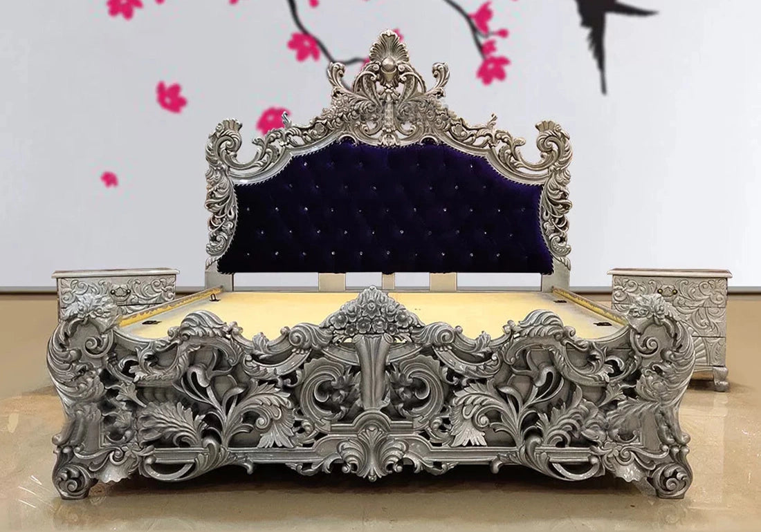 Indulge in a new level of elegance with this Elegant Modern Designer Silver Bed Set, meticulously crafted from the finest teak wood. This bed set flawlessly blends traditional beauty and modern usefulness, blending timeless elegance with cutting-edge design. The warm, natural tones of teak wood make a fascinating focal point for your bedroom, emanating warmth and creativity.