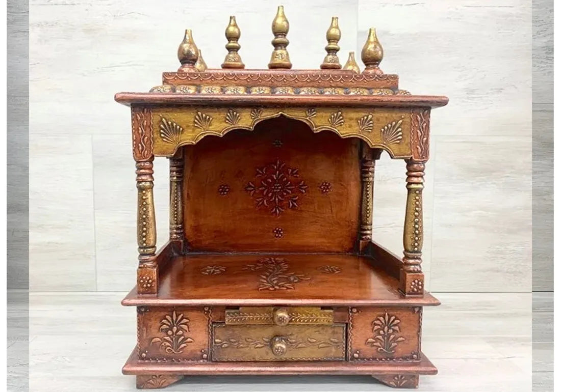 The temple is meticulously constructed from premium teak wood, known for its durability, rich color, and distinct grain patterns. The wood's natural warmth and elegance create an inviting atmosphere in any room. What truly sets this temple apart is its intricate hand-carved detailing, which often features traditional motifs, religious symbolism, and elaborate designs inspired by centuries-old temple architecture. These carvings imbue the temple with an aura of sacredness and reverence.