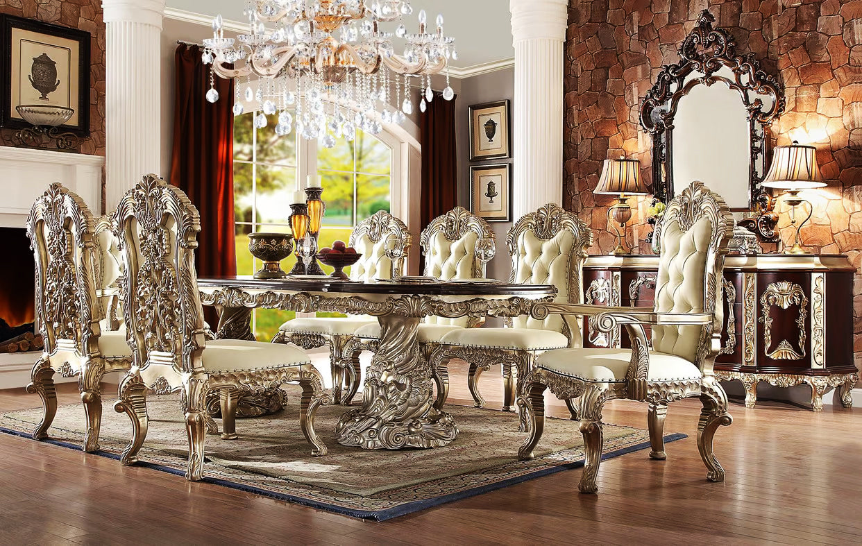 Indulge in the allure of vintage-inspired design with the Carved Dining Set with Upholstered Chairs. Let the clarity of the design, the precision of the carvings, and the silver-tone finish transport you to a world of timeless beauty and refinement.