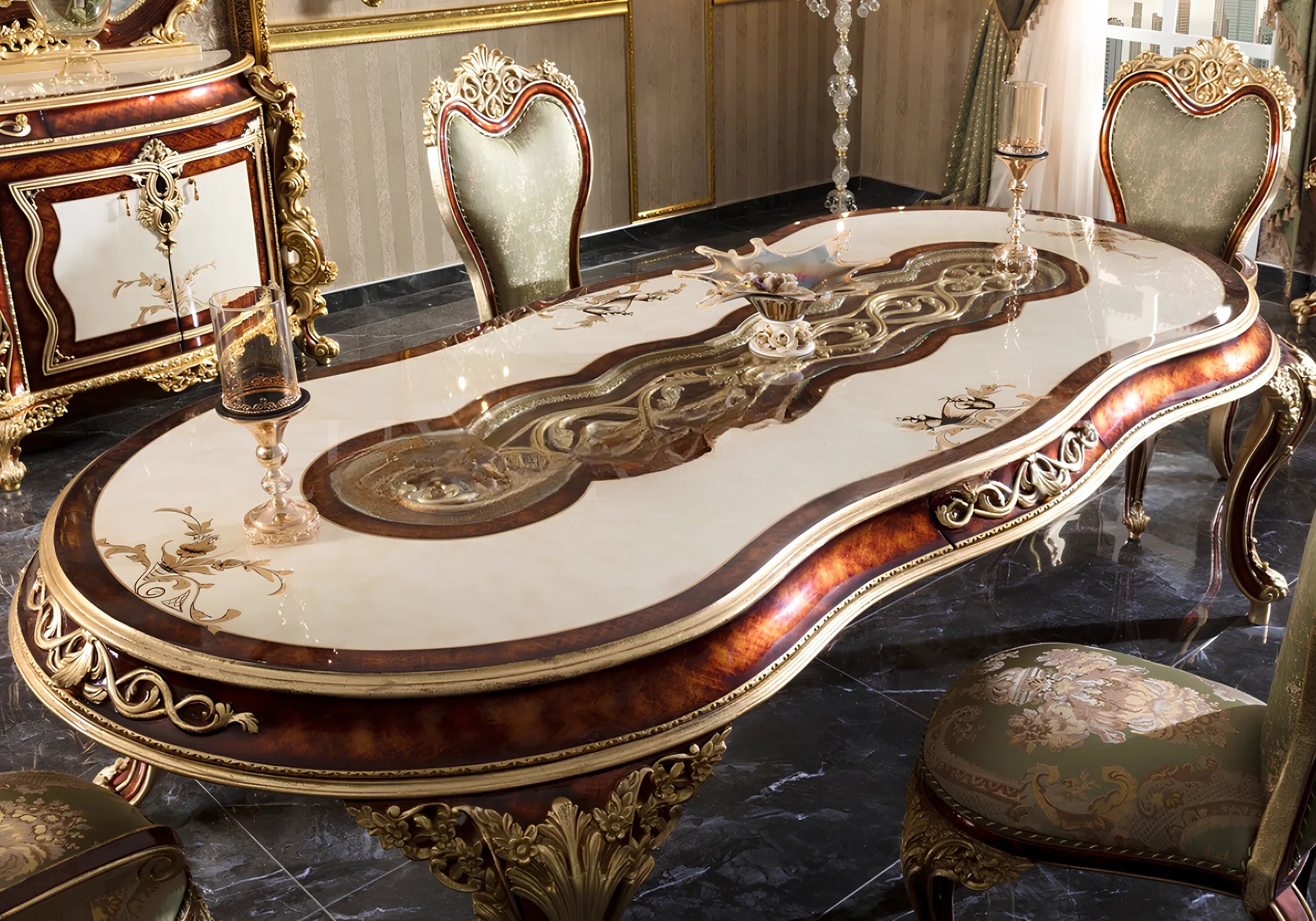The centerpiece of this set is the dining table, meticulously crafted to perfection. It features exquisite carvings that showcase the intricate detailing and artistry involved in its creation. The table's design exudes a sense of luxury and sophistication, making it a focal point in any dining space.