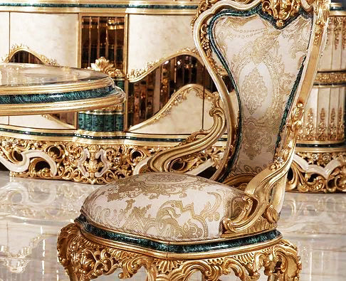 Complementing the dining table are the matching dining chairs, also made from solid teak wood with intricate carvings. These chairs offer both comfort and style, featuring upholstered seats that provide a cozy dining experience. The combination of solid teak wood and meticulous carvings creates a harmonious and luxurious dining set that will impress your guests.