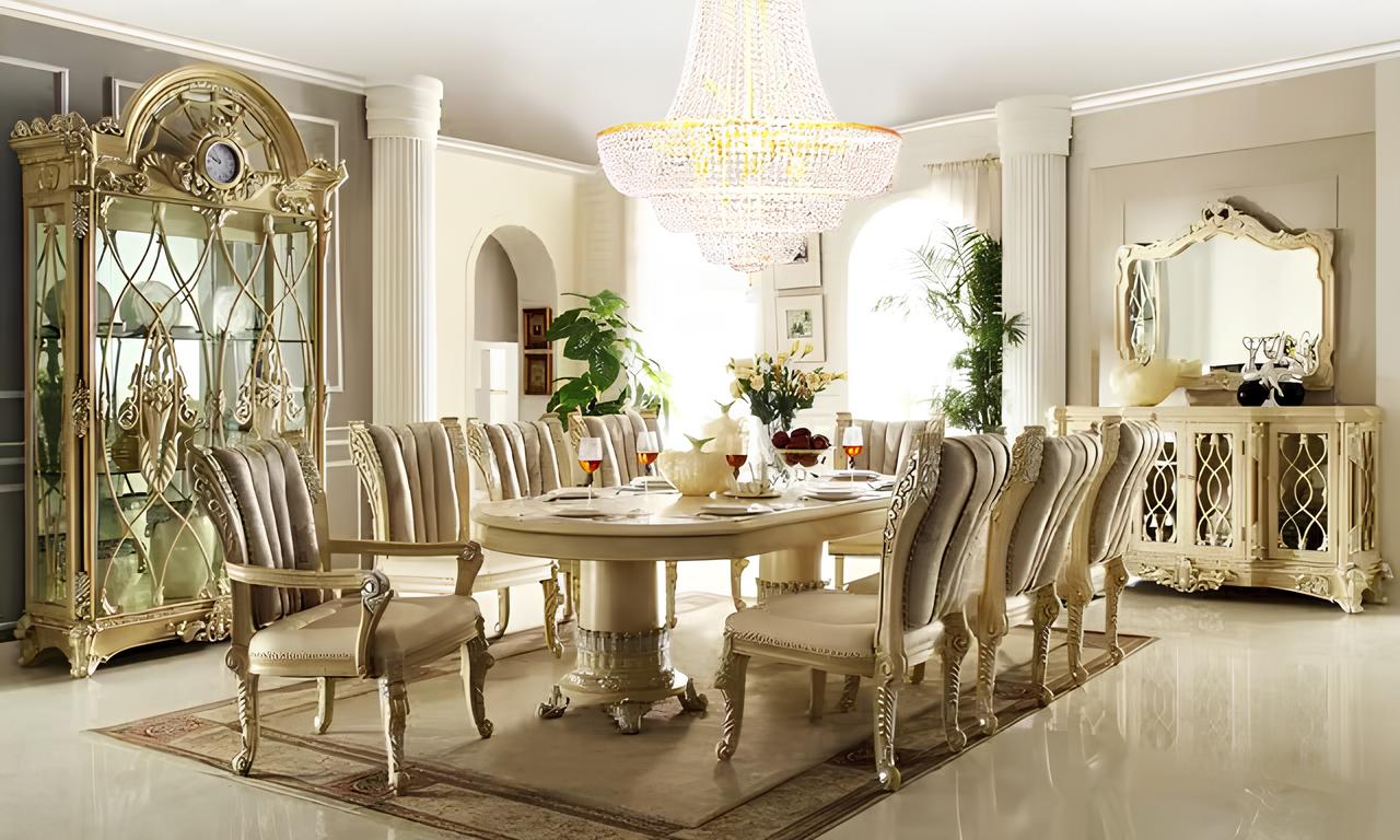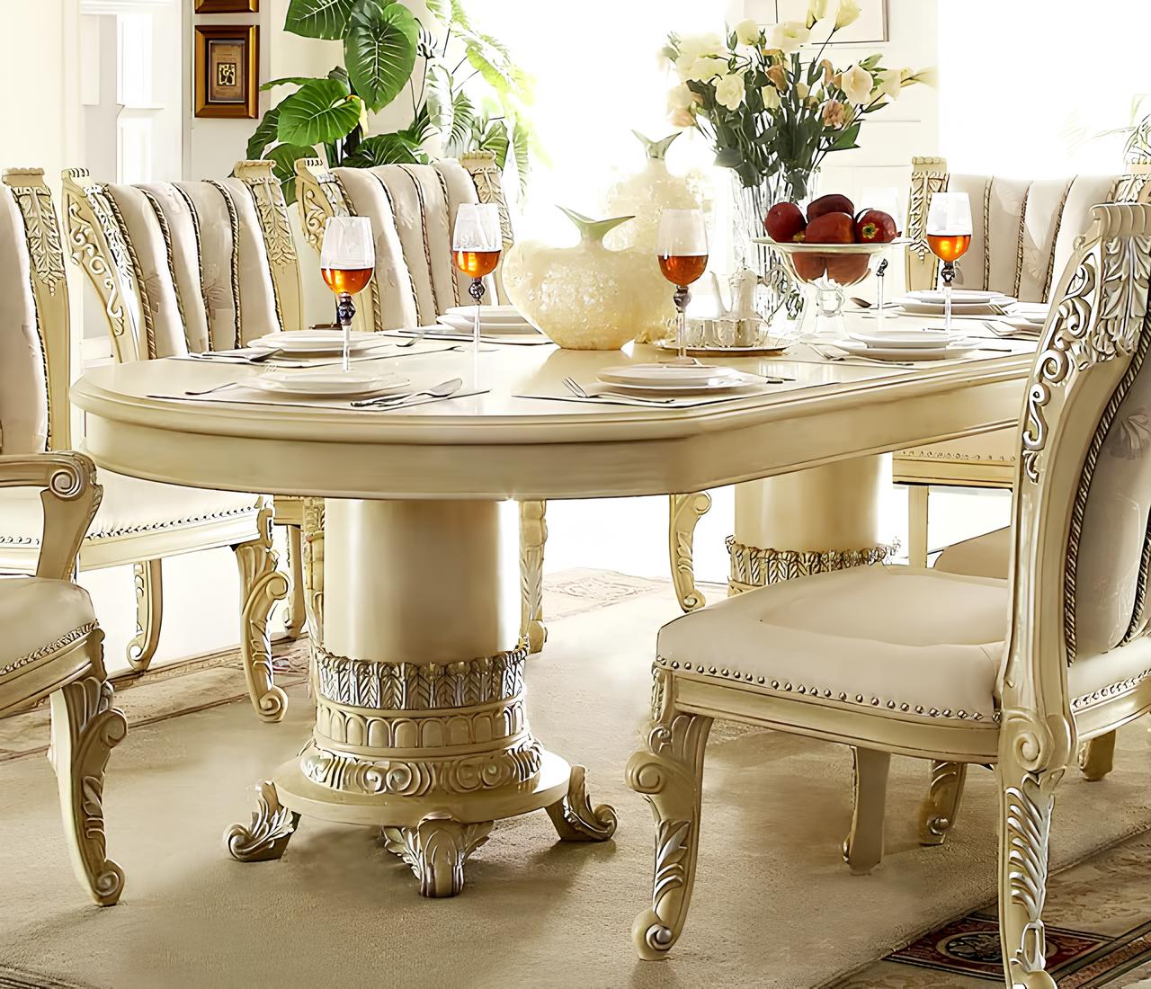Indulge in the everlasting charm of the elegant Cream Pearl Wood Oval Dining Table Set by a Healsway. This exquisite set comprises a dining table Combining the brilliance of classic European style with a touch of timeless grace, this Traditional Cream Pearl Wood Formal Oval Dining Table Set mesmerizes with its intricate carvings and overlays. Meticulously crafted from carefully chosen hardwoods and resin, the set boasts an antique beige finish that transports you to a bygone era. Experience the pinnacle of luxury dining with this Victorian-style Formal Dining Room Set. It's ornate carvings and European design elements create an attractive framework that exudes opulence from every angle. The oval-shaped dining table features a meticulously carved top supported by dual columns, showcasing impeccable craftsmanship. Designed for both comfort and sophistication, the four side chairs and two armchairs are luxuriously upholstered in plush fabric and adorned with tasteful carved accents. To cater to your needs, optional storage pieces such as a buffet, china cabinet, and curio cabinet are available.