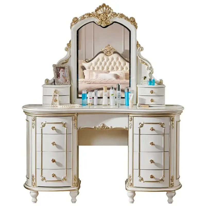 Introducing our exquisite White Luxury Solid Teakwood Carving Dressing Table, a true masterpiece of elegance and craftsmanship. This stunning piece of furniture combines the finest materials with meticulous detailing, designed to enhance the beauty of any luxurious bedroom or dressing area.