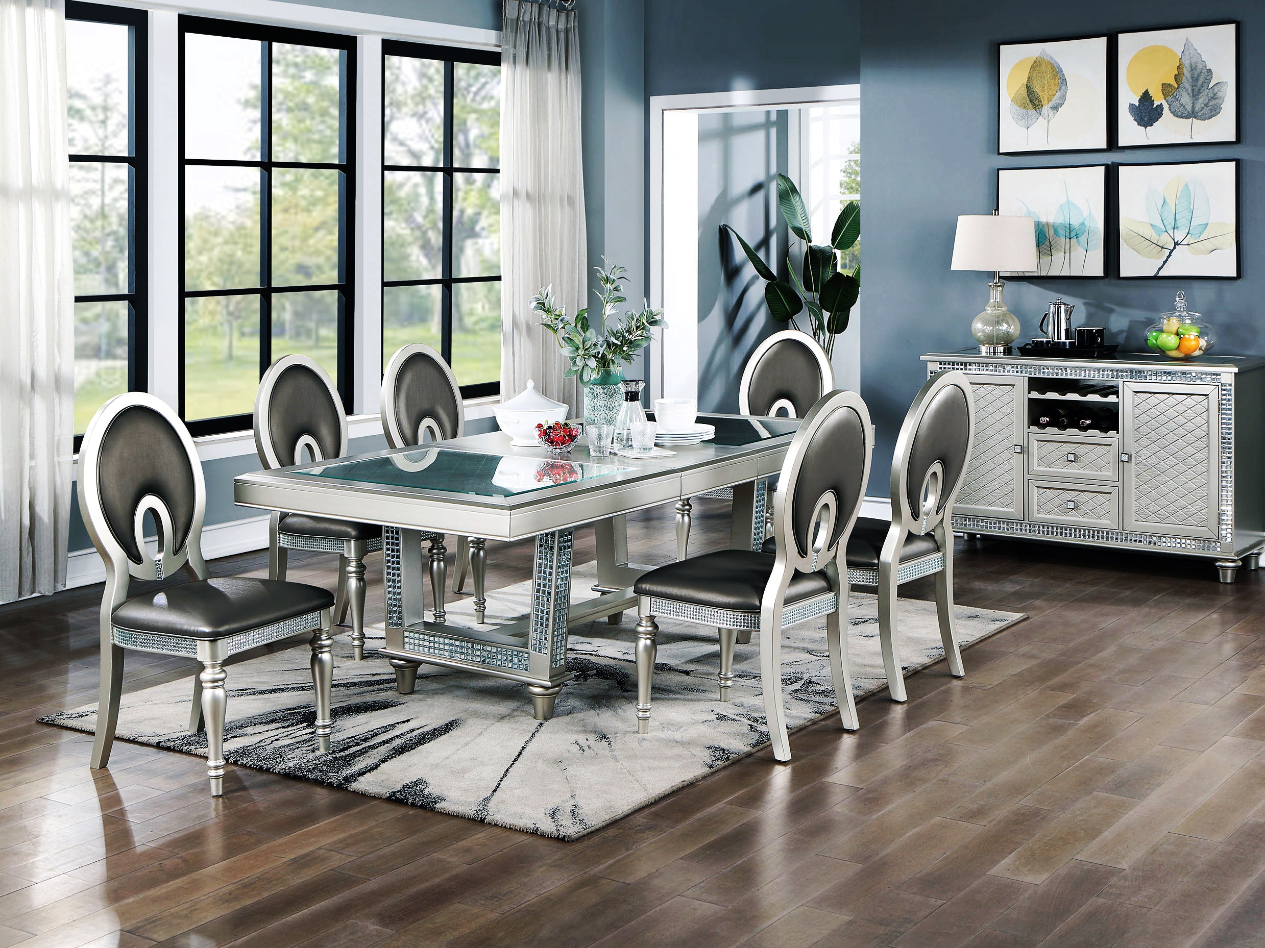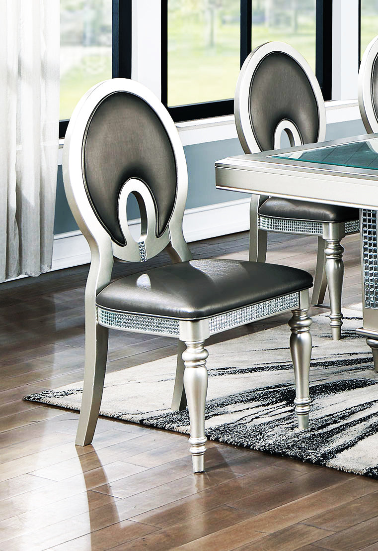 Indulge in the contemporary allure of our dining set, crafted with hardwood construction and available in a luxurious platinum finish. The set includes chairs that provide a comfortable spot for you and your guests to enjoy meal after meal.