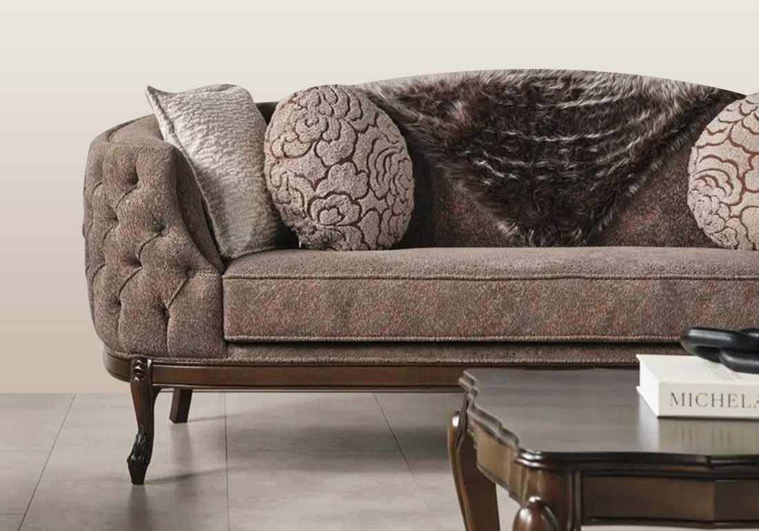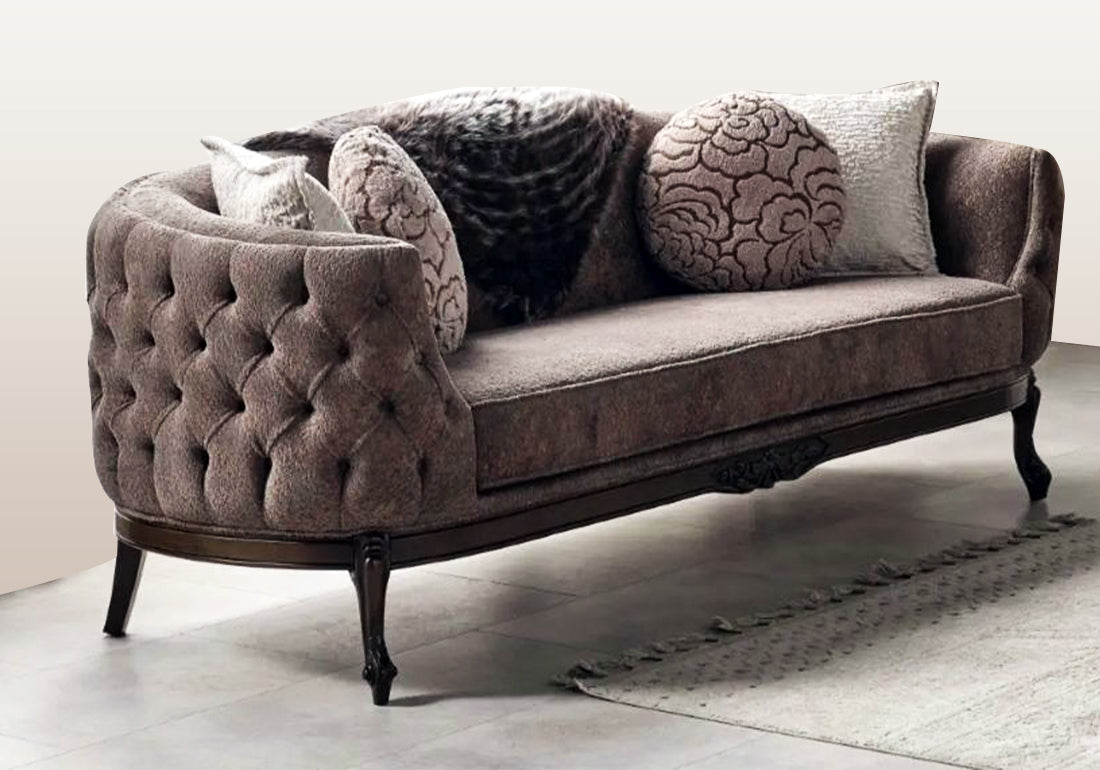 The frame is constructed from high-quality, sustainably sourced wood, known for its durability and strength. The intricate carvings and detailed woodwork give the sofa a rich, regal look, making it an exquisite addition to any home. The wood’s natural grains and finish bring warmth and character, while the craftsmanship speaks to a dedication to quality and fine design.