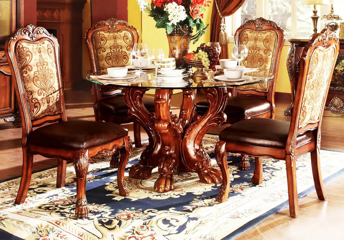 The Dresden collection boasts a pedestal table with oversized claw feet, a testament to its grandeur. The shaped top and decorative carving inlay veneers on the apron add a touch of elegance and sophistication to the overall design.