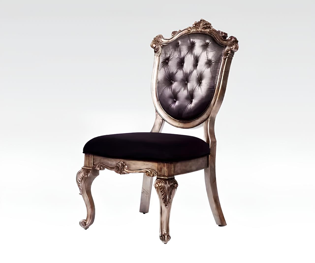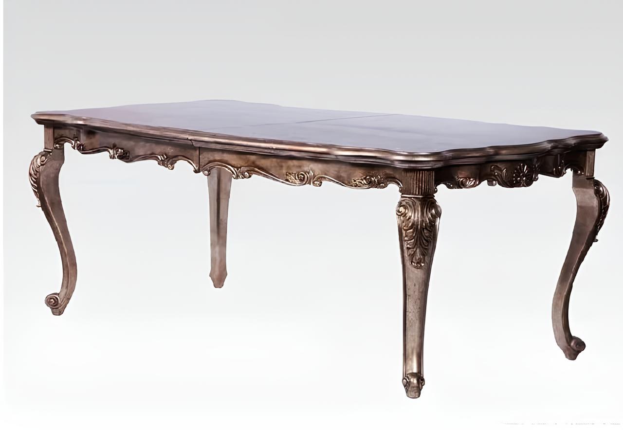 The centerpiece of this collection is the beautiful floral carved leg table, available in two different sizes. The intricate carving adds a delicate and sophisticated touch, creating a focal point that exudes grace and beauty. The table is complemented by French rococo tufted silver gray silk-like fabric chairs, which feature antique-inspired accents. These chairs provide both comfort and style, creating a luxurious seating arrangement for your formal dining room.