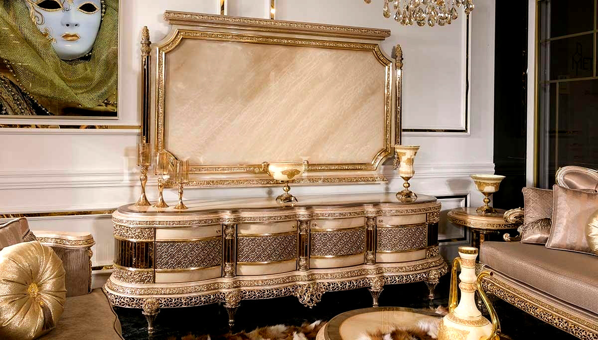 Introducing our exquisite Gold Hand Carved TV Unit, where opulence meets functionality. Crafted with meticulous attention to detail, this stunning piece seamlessly blends classical elegance with modern sophistication. The lustrous golden finish adds a touch of glamour, while the intricate hand-carved designs showcase the skill and artistry of our master craftsmen. This TV unit not only elevates your living space with its luxurious presence but also provides ample storage for your entertainment essentials. Experience the epitome of luxury and make a bold statement with our Gold Hand Carved TV Unit, an heirloom piece that will captivate and inspire for generations to come.