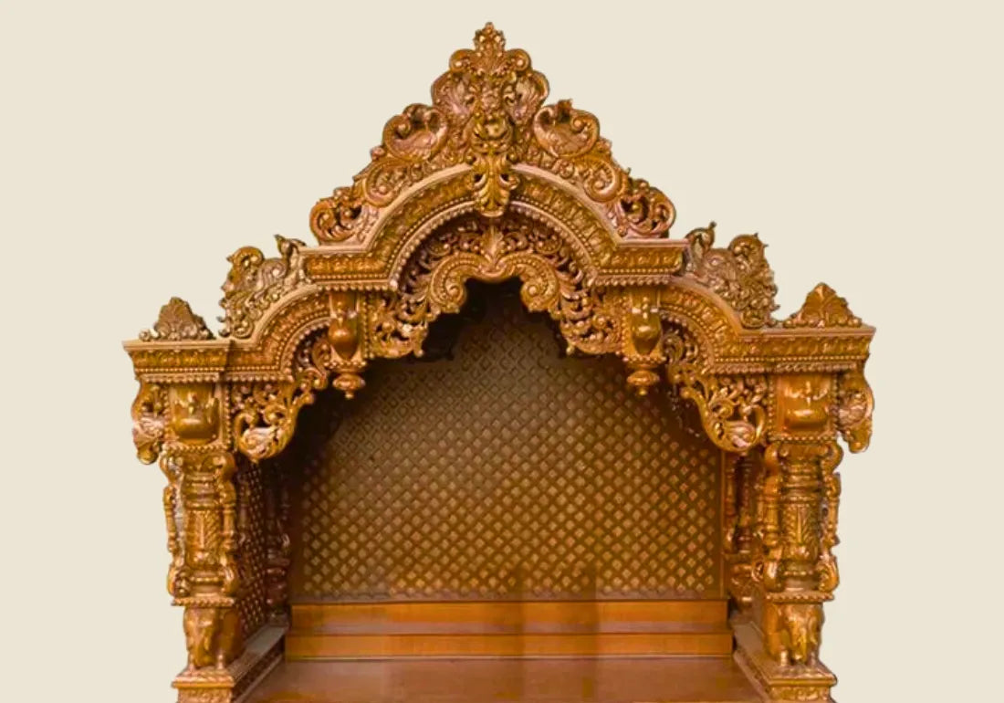 Its royal design and regal presence make it the focal point of any room. The exquisite woodwork and intricate carvings showcase the artistry and craftsmanship that went into its creation. The temple's rich wood finish enhances its visual appeal, creating an atmosphere of warmth and spirituality.