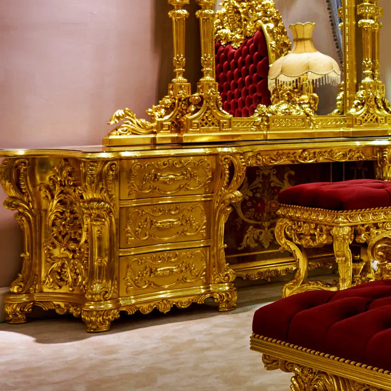 Indulge yourself in the opulence of the Luxury Gold Solid Teakwood Carving Dressing Table and immerse yourself in a world of beauty, luxury, and refinement.