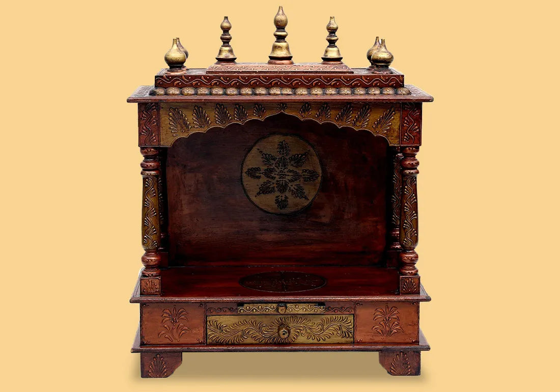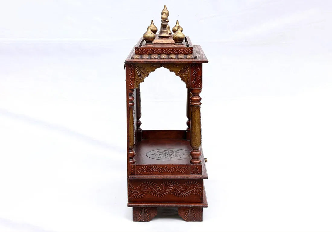 The temple typically includes a spacious and elevated platform that serves as an altar for the placement of deities, idols, or sacred images. The backdrop of the temple is adorned with intricately carved designs that serve as a visual focal point for your daily prayers and rituals. It may also offer practical storage solutions such as drawers and shelves, allowing you to keep essential religious items organized and readily accessible.