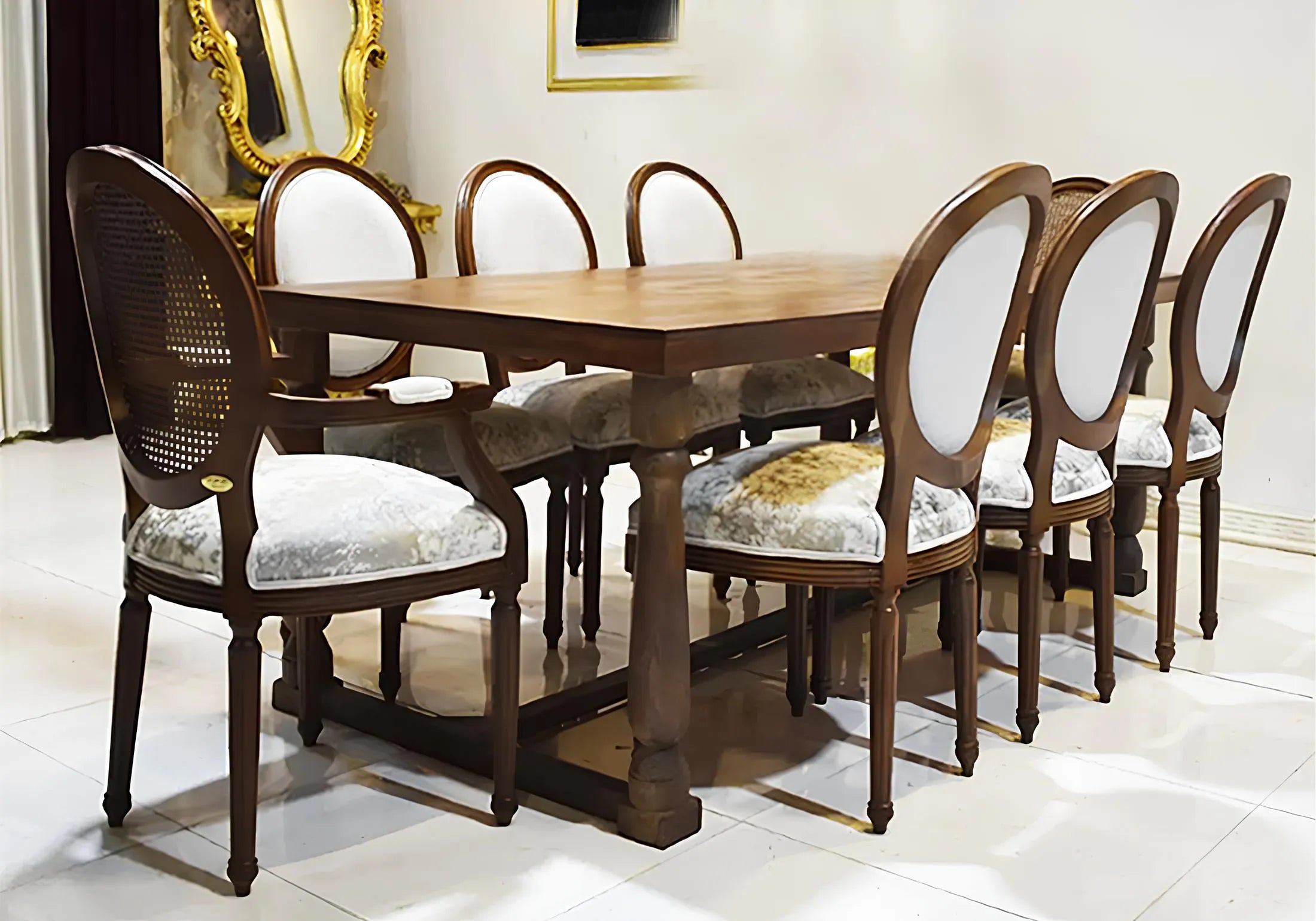 Enhance your dining space with our exquisite Wooden and Classical Handmade Dining Table Set. Crafted with meticulous care and attention to detail, this dining table set is a timeless addition to any home. The natural beauty of the wood shines through, exuding warmth and elegance. Whether you're hosting a family dinner or entertaining friends, this set will be the centerpiece of memorable gatherings. With its classic design, it effortlessly complements a variety of decor styles. Elevate your dining experience with this artisanal masterpiece, designed not only for aesthetics but also for durability. Explore the perfect blend of tradition and modernity in every meal you share. Invest in the enduring charm of this Wooden and Classical Handmade Dining Table Set and make a statement in your dining room that will last for generations.
